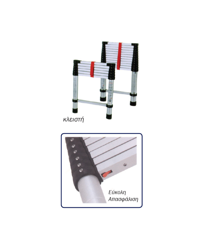 Αρχικά, ο έξυπνος τηλεσκοπικός μηχανισμός κάνει τη διαφορά στη χρήση. Ειδικότερα, προσαρμόζετε το ύψος ακριβώς στα μέτρα που επιθυμείτε, ανάλογα με την εργασία. Έτσι, ξεδιπλώνετε τη σκάλα βαθμίδα-βαθμίδα, ενώ το αυτόματο κλείστρο ασφαλίζει το κάθε σκαλί ξεχωριστά με ένα χαρακτηριστικό “κλικ”. Επιπλέον, το τετράγωνο προφίλ των σκαλοπατιών (30x30mm) εξασφαλίζει σταθερό πάτημα, γεγονός που αποτρέπει την ολίσθηση του υποδήματός σας.